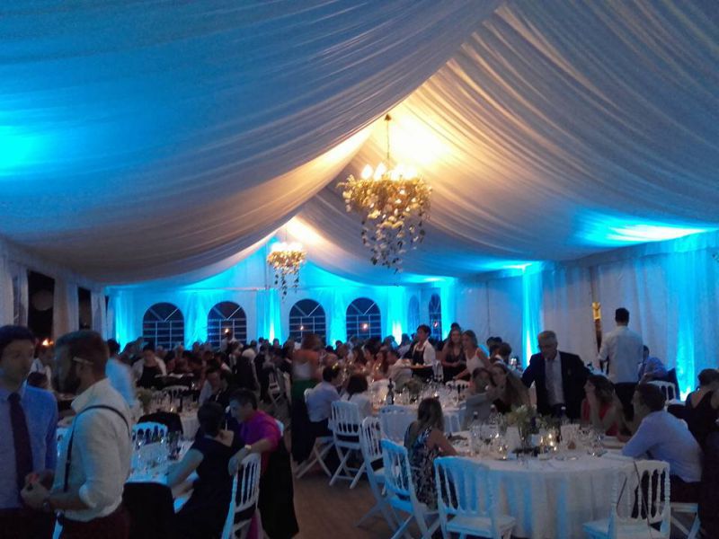 Intérieur Modèle 10m de largeur avec velum-lustres et lumière bleue scénique